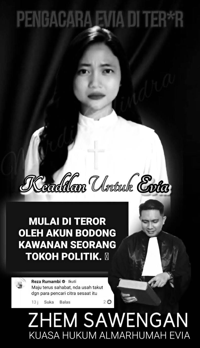 Di tengah proses hukum yang masih berjalan, muncul dinamika baru yang menimbulkan kekhawatiran. Zhem Sawengan, salah satu kuasa hukum keluarga almarhumah Evia, mengaku menerima pesan singkat bernada intimidatif dari akun tak dikenal melalui salah satu platform media sosial.