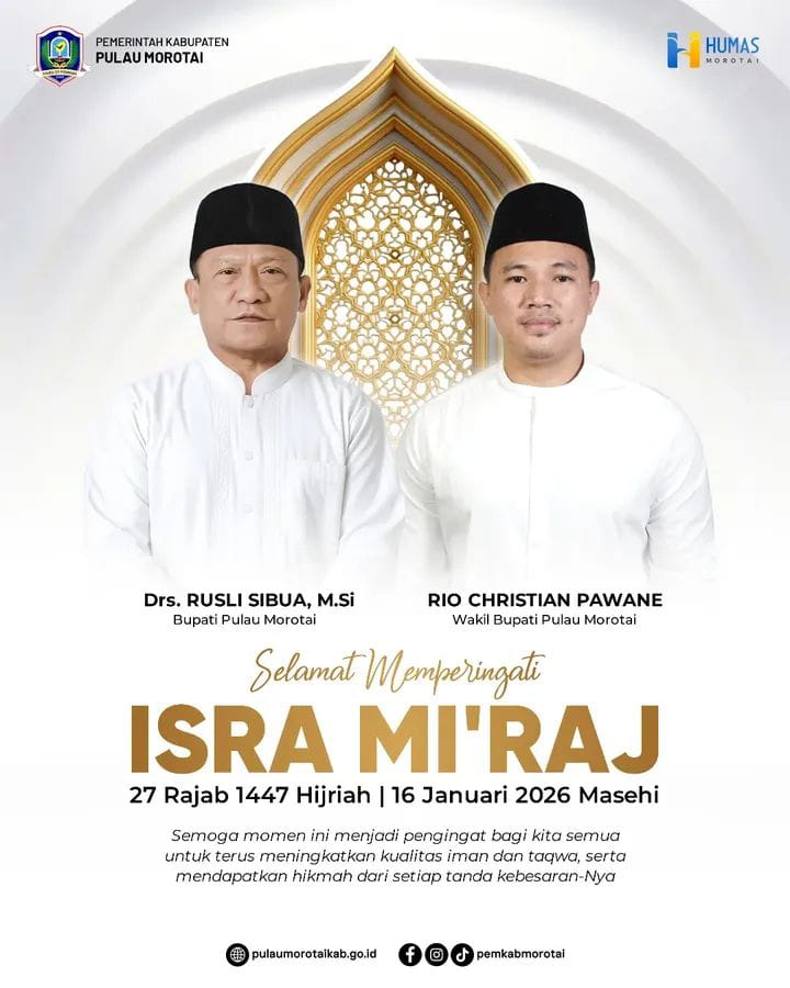Morotai, Lintasadatdanbudaya.com – Pemerintah Kabupaten Pulau Morotai menyampaikan ucapan Selamat Memperingati Isra’ Mi’raj Nabi Muhammad SAW 27 Rajab 1447 Hijriah/2026 Masehi kepada seluruh umat Muslim di Kabupaten Pulau Morotai.