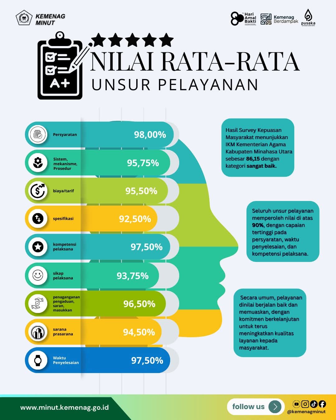 Capaian ini menunjukkan bahwa pelayanan Kemenag Minahasa Utara tidak hanya berjalan secara administratif, tetapi dirasakan langsung manfaat dan kualitasnya oleh masyarakat pengguna layanan.