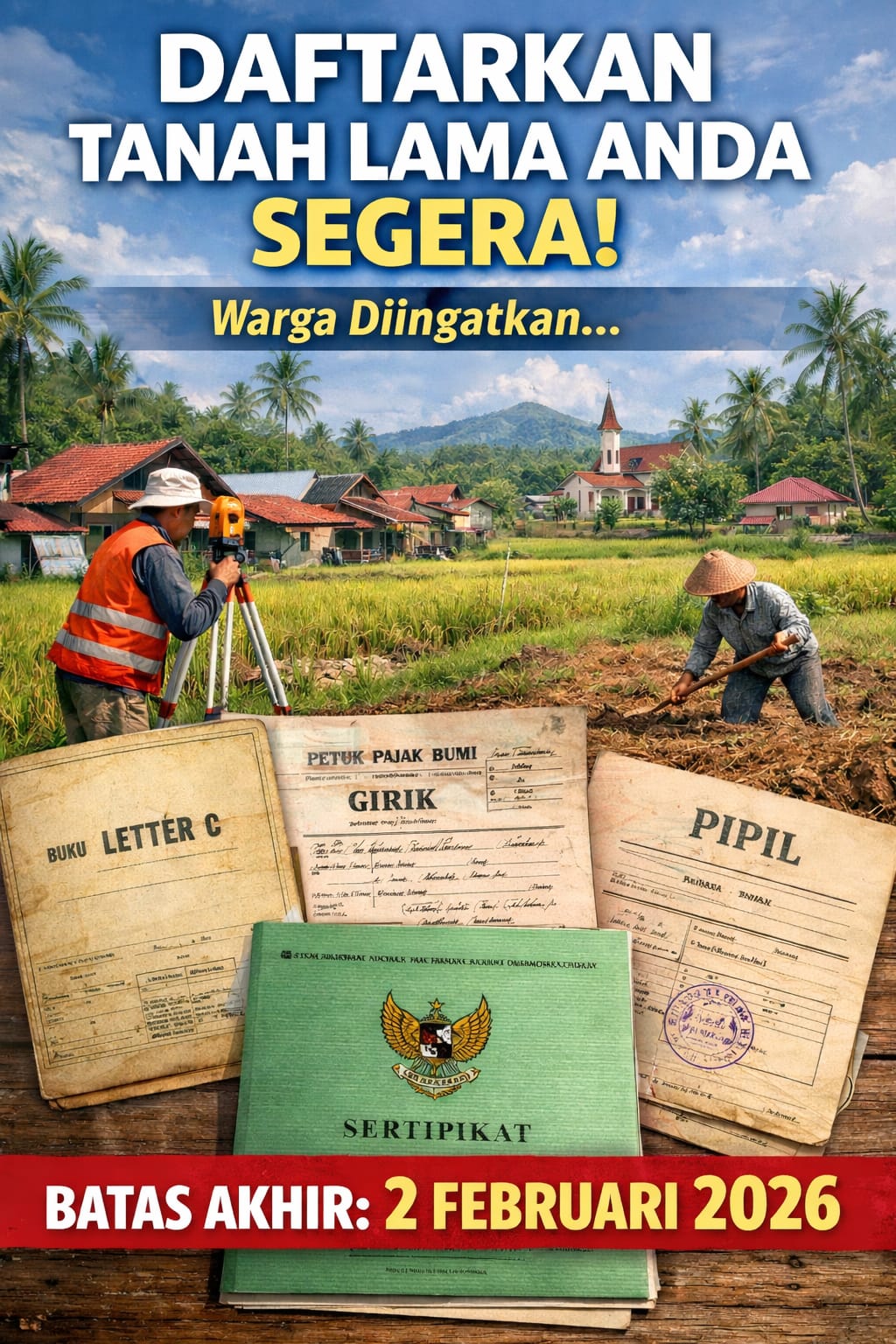 Batas akhir pendaftaran bukti kepemilikan tanah lama adalah 2 Februari 2026. Setelah tanggal tersebut, dokumen tradisional kehilangan kekuatan hukum sebagai bukti kepemilikan. Sertifikat tanah yang diterbitkan oleh BPN menjadi satu-satunya bukti hak terkuat dan sah secara hukum.