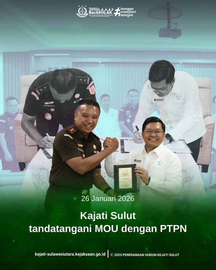 MANADO, Lintasadatdanbudaya.com – Kejaksaan Tinggi Sulawesi Utara (Kejati Sulut) terus memperkuat peran strategisnya dalam mendukung tata kelola Badan Usaha Milik Negara (BUMN). Hal ini ditandai dengan penandatanganan Perjanjian Kerja Sama (Memorandum of Understanding/MoU) antara Kepala Kejaksaan Tinggi Sulawesi Utara, Jacob Hendrik Pattipeilohy, S.H., M.H., dengan PT Perkebunan Nusantara I (PTPN) Regional 8, yang diwakili oleh Regional Head sekaligus Business Support Head Regional 8 PTPN I, Misran, di Manado.Senin(26/01/2026)