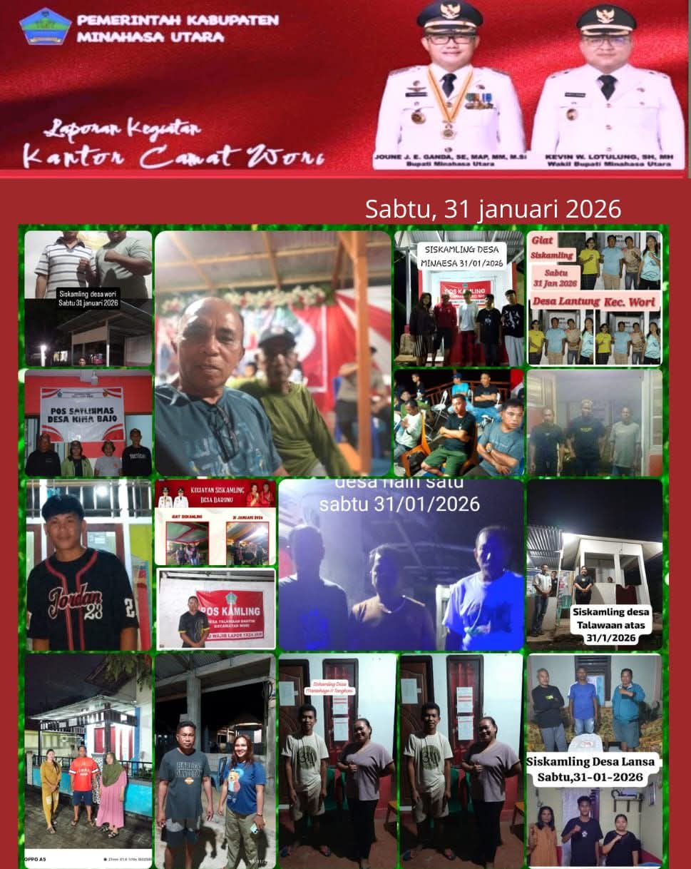 Kecamatan Wori, Lintasadatdanbudaya.com – Giat Siskamling (Sistem Keamanan Lingkungan) yang dilaksanakan pada hari Sabtu, 31 Januari 2026 di Kecamatan Wori telah berjalan dengan lancar, aman, dan kondusif. Kegiatan ini melibatkan berbagai unsur, termasuk Hukum Tua, Babinsa, Babinkamtibmas, Perangkat Desa, Linmas, dan masyarakat setempat. (31/01/2026)