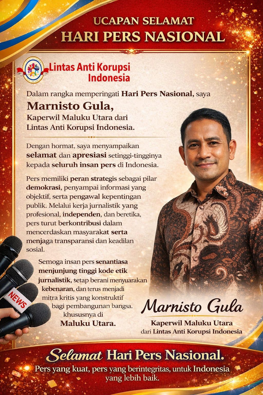 Pada momentum Hari Pers Nasional ini, Marnisto Gula mengajak seluruh insan pers untuk terus menjaga profesionalisme, memperkuat literasi publik, serta menjadi mitra kritis yang konstruktif bagi pembangunan bangsa.